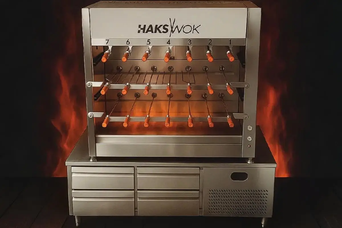 Electrically powered with top radiant heat, this grill features 21 motorized skewers rotating for uniform, spectacle-grade grilling. Clean, consistent, and high on visual appeal.